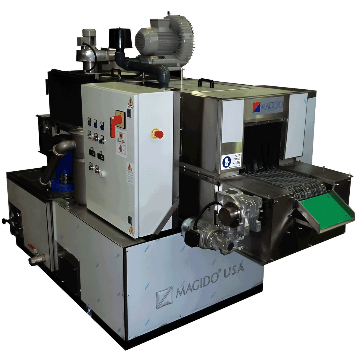 Gold 1b Series G800 2-phase In-line Belt Conveyor Aqueous Parts Washer cleans parts automatically in a continuous process. |
