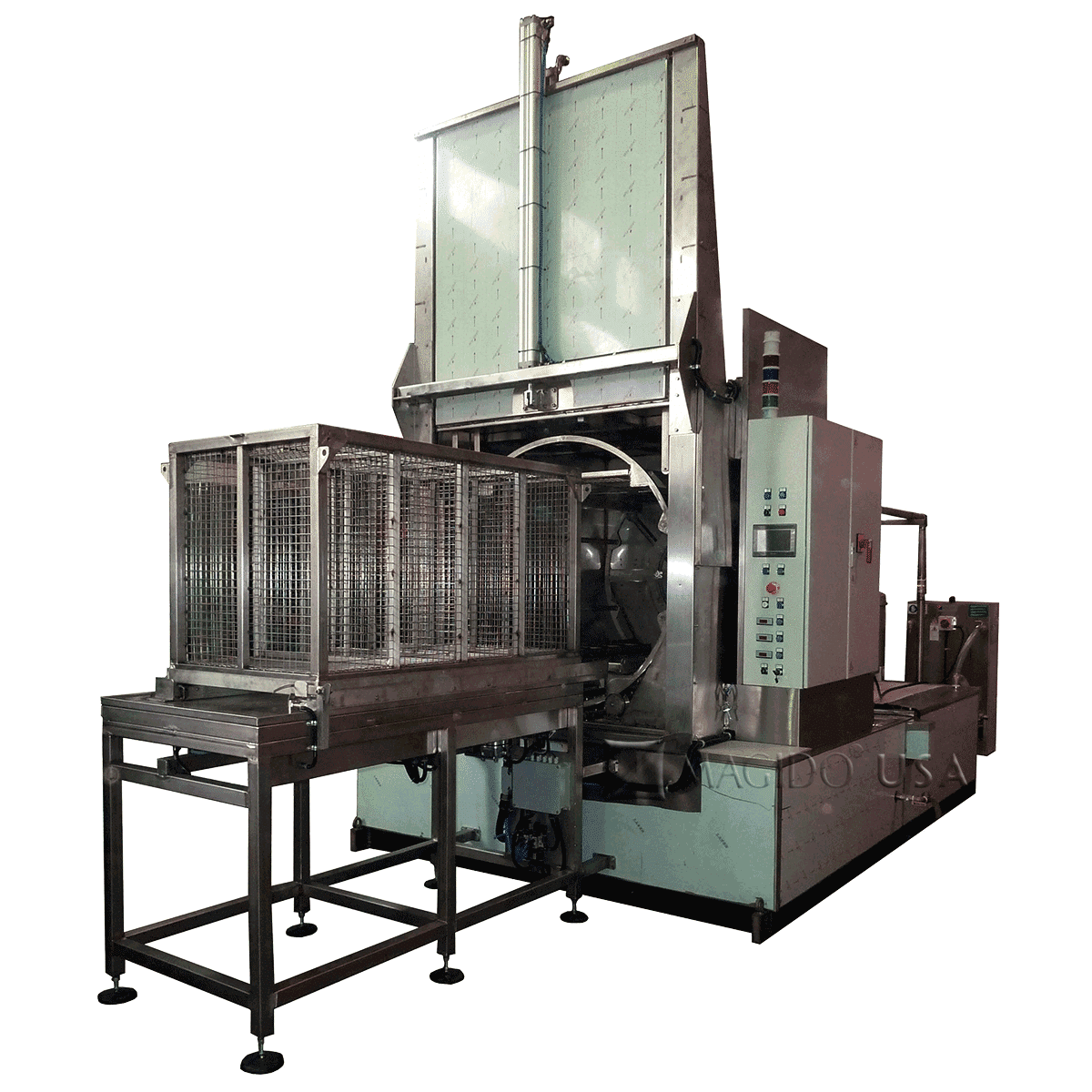 The Platinum Series Front Load P900/2 Rotary Immersion Parts Washer uses a containment basket to submerge parts in a 3 stage wash system. |