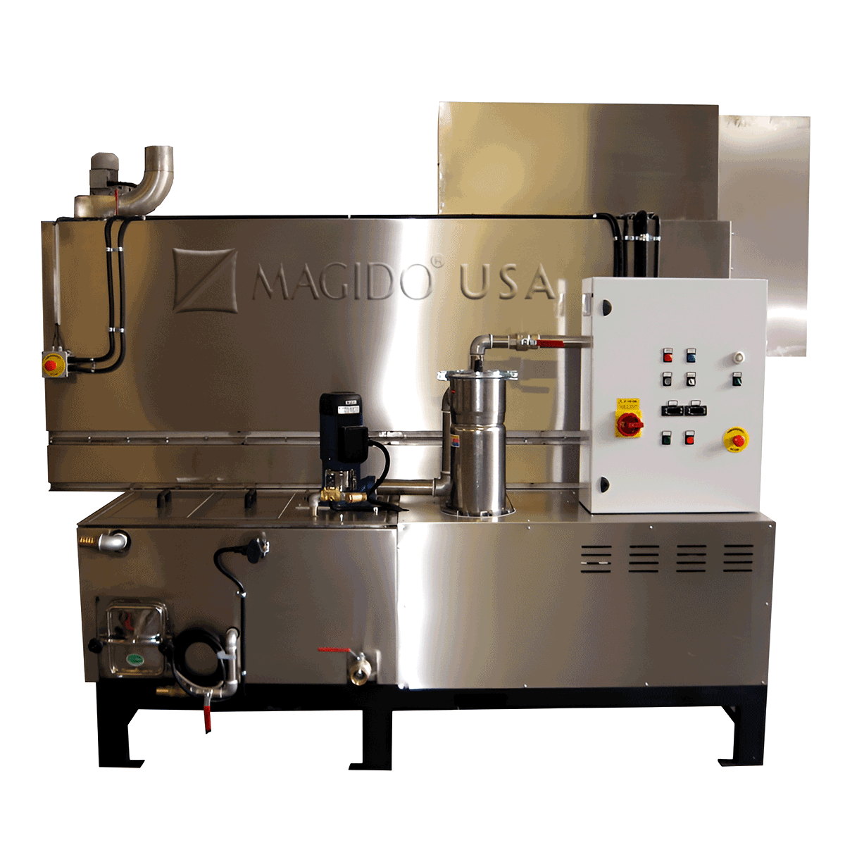 MAGIDO rotary drum parts washers are perfect for continuous cleaning & drying of high volume, small parts when part-on-part contact is acceptable. In operation, as parts auger through the machine’s processing drum, they are first submerged in cleaning solution, spray-washed, then sprayed in an optional rinse, followed by optional heated drying stage. These units are a complete feed-thru operation, which allows for parts to be automatically fed directly from the wash to the optional rinse and drying stages.