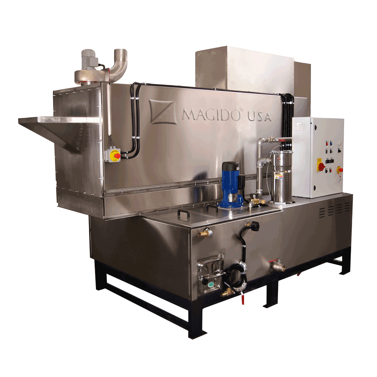 MAGIDO rotary drum parts washers are perfect for continuous cleaning & drying of high volume, small parts when part-on-part contact is acceptable. In operation, as parts auger through the machine’s processing drum, they are first submerged in cleaning solution, spray-washed, then sprayed in an optional rinse, followed by optional heated drying stage. These units are a complete feed-thru operation, which allows for parts to be automatically fed directly from the wash to the optional rinse and drying stages.
