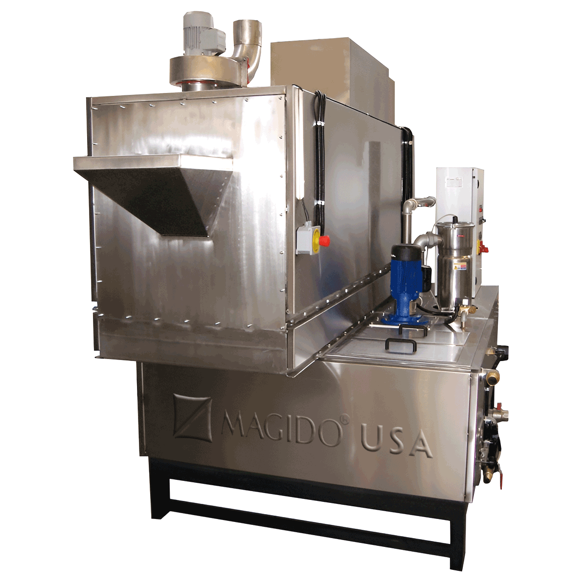 MAGIDO rotary drum parts washers are perfect for continuous cleaning & drying of high volume, small parts when part-on-part contact is acceptable. In operation, as parts auger through the machine’s processing drum, they are first submerged in cleaning solution, spray-washed, then sprayed in an optional rinse, followed by optional heated drying stage. These units are a complete feed-thru operation, which allows for parts to be automatically fed directly from the wash to the optional rinse and drying stages.
